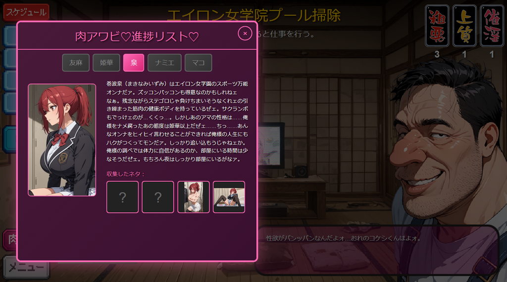 巻波泉(まきなみいずみ)はエイロン女学園のスポーツ万能オンナだァ。ズッコンバッコンも得意なのかもしれねェなぁ。残念ながらステゴロじゃ負けちまいそうなくれェの引き締まった筋肉の健康ボディを持っているぜェ。サクランボもでっけェのが…くくっ…。しかしあのアマの性格は……俺様をナメ腐ったあの態度は姫華以上だぜェ……ちっ……あんなオンナをヒィヒィ言わせることができれば俺様の人生にもハクがつくってモンだァ。しっかり追い込もうじゃねェか。俺様の調べでは体力に自信があるのか、部屋にいる時間は少なそうだゼェ。もちろん夜はしっかり部屋にいるがなァ。