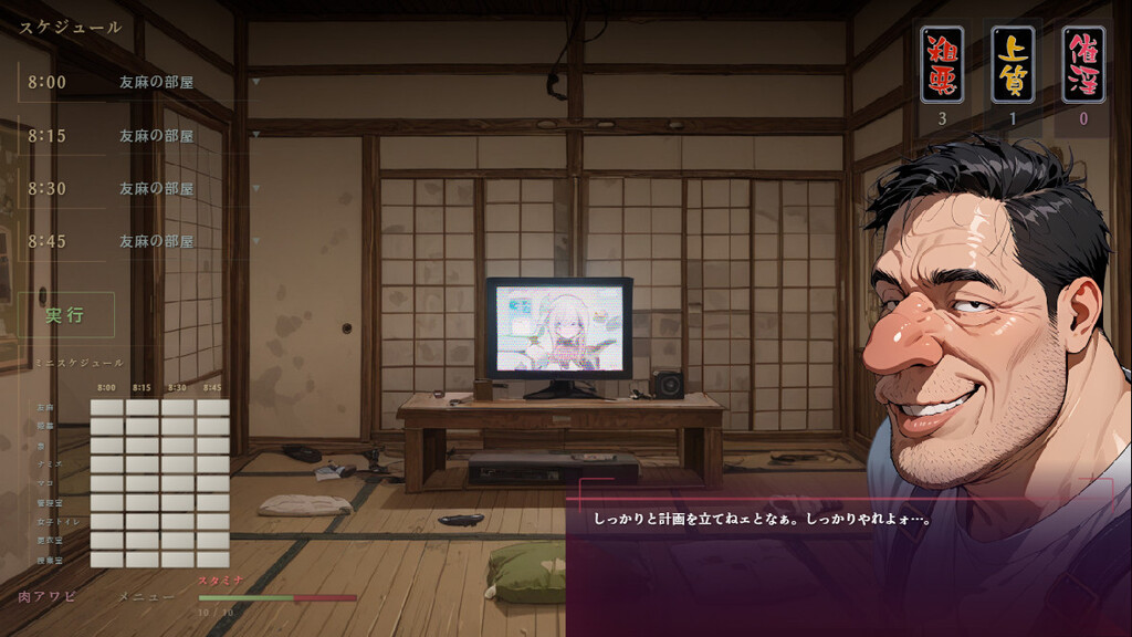 今は2026年で、スマートフォンが普及しきった世の中です。スマホを使って女の子のネタを盗撮し、追い込むための材料集めに奔走します。また、主人公は女子寮の管理人という立場であるため、管理人としてのお仕事もこなさなければなりません。また、疲労度システムを用意していますので、主人公の疲労、管理人としての仕事、追い込み用のネタ集めの収集活動、これらをバランスよく行っていく必要があります。