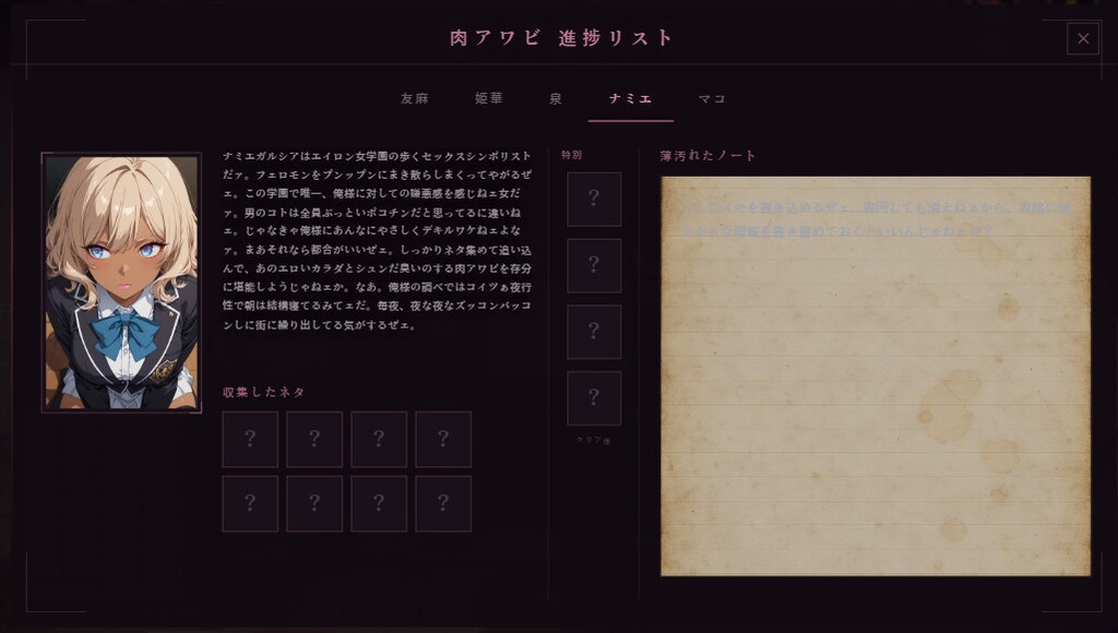 緻密にスケジュールを組まなきゃ、全員のオンナどもを追い込むなんてできねェだろォ?肉アワビリストには、狙いを定めたオンナどもの収集ネタの情報を書き留めてよォ……必要な情報はこのノートに書き留めていりゃあよ…くくっ…何かあっても役に立つんじゃあねェか?