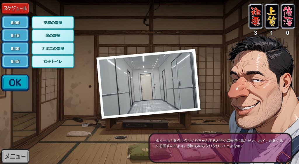 今は2026年で、スマートフォンが普及しきった世の中です。スマホを使って女の子のネタを盗撮し、追い込むための材料集めに奔走します。また、主人公は女子寮の管理人という立場であるため、管理人としてのお仕事もこなさなければなりません。また、疲労度システムを用意していますので、主人公の疲労、管理人としての仕事、追い込み用のネタ集めの収集活動、これらをバランスよく行っていく必要があります。